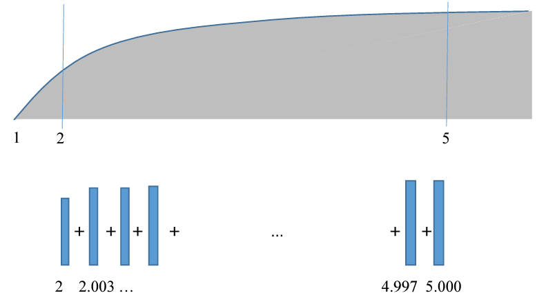 Le calcul de l’intégrale se fera selon une méthode simple d’accumulation de toutes les valeurs de la fonction de calcul entre les limites a et b. On subdivisera en 1000 tranches la fonction et cumuler les surfaces rectangulaires selon le principe suivant :