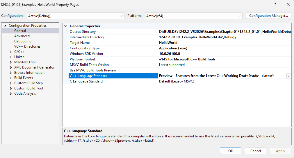 error: no match for 'operator>>' (operand types are 'std::istream' {aka 'std::basic_istream<char>'} and 'char*')Avec Visual Studio, il faut donc s’assurer d’utiliser la version C++23, et pas une version plus ancienne.