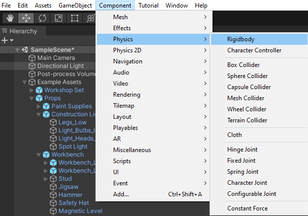 Par exemple, pour pouvoir contrôler un GameObject avec de la physique, il faut lui rajouter le Component RigidBody dans le menu Components / Physics / Rigidbody :