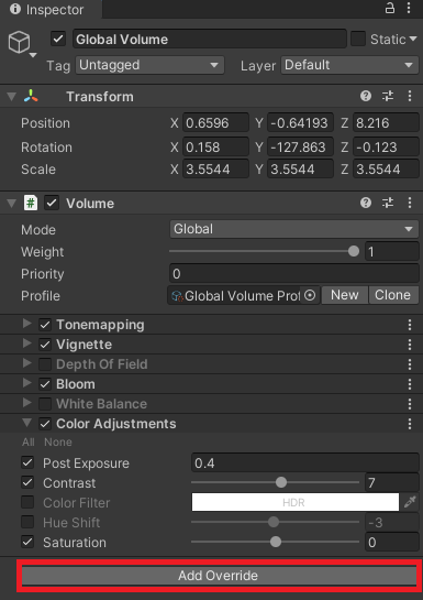 Pour modifier les paramètres des effets de Post-Processing, il faut donc ajouter des Overrides au Profile.