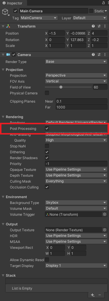 Pour activer le calcul des effets de Post-Processing pour la caméra qui nous intéresse, il faut sélectionner notre Camera, et dans la section Rendering, activer le paramètre Post Processing :