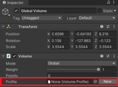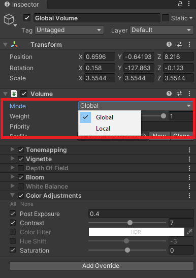 Pour commencer, nous pouvons créer un Global Volume : dans ce cas, les effets attachés à ce Volume sont toujours appliqués à la caméra.