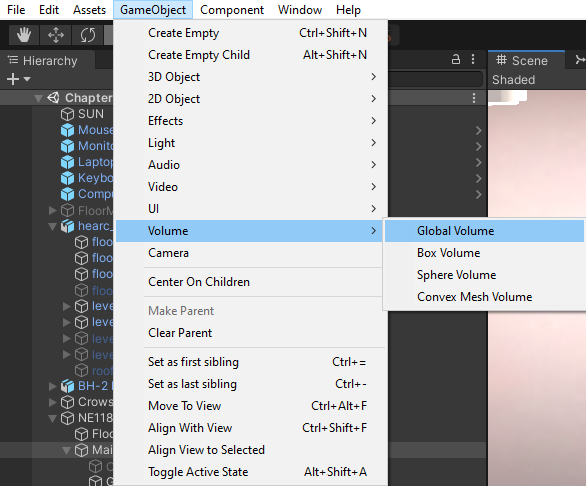 Il faut donc aller dans le menu GameObjects > Volume > Global Volume :