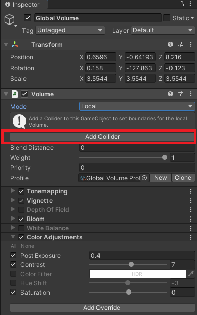 Une fois le Volume en mode Local, il faut lui attacher un Collider :