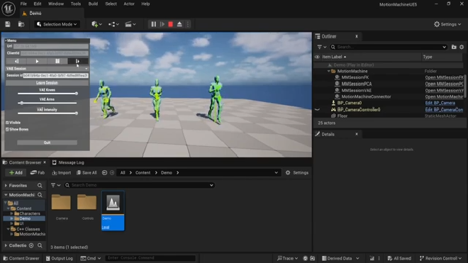 Motion Machine est une API web développée par le groupe imagerie de la HE-Arc permettant de générer et streamer des animations de course en temps réel. Plusieurs clients intégrant Motion Machine existent, dont un pour GeeXLab et notamment GIM3D, un client pour Unity. Grâce à ces clients, il est possible de modifier en temps réel les mouvements de course. Afin d’élargir les clients intégrant Motion Machine et comparer les performances, un portage sur UE5 a été effectué. Une comparaison a été faite avec le portage Unity, permettant de déterminer qu’un problème existant de stutters occasionnels des animations streamées venait probablement du côté de Motion Machine plutôt que du portage Unity. Les routes principales de l’API sont accessibles sur UE5, que ce soit dans l’éditeur ou à l’exécution